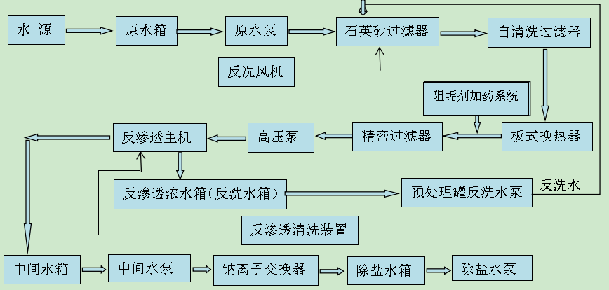 原水池+原水泵+ 多介質過濾+板式換熱器+ +增壓泵+阻垢劑加藥裝置+5µm保安過濾器+高壓泵+反滲透裝置+反滲透水箱+中間水泵+鈉離子交換器+除鹽水箱+除鹽水泵